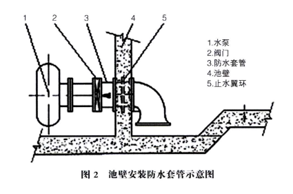 為確保管道與池壁接觸處防水效果以及避免水泵等設備運行時產生振動使接觸處松動,安裝帶有止水翼環(huán)(如圖1中⑩所示)的防水套管(如圖1中⑥所示)。防水套管的安裝與模板、鋼筋的施工同步進行,密切配合,做到高程、位置完全準確,安裝牢固。套管穿越處池壁中的鋼筋彎曲或截斷時,鋼筋與套管焊接相連,套管四周按設計要求安裝加同筋。防水套管施工如圖2所示。