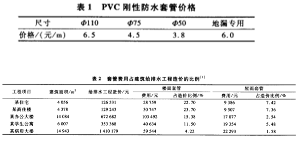 建筑施工給排水工程施工說明規(guī)定:管道穿越樓面、屋面、水箱,需預(yù)埋剛性防水套管。工程實(shí)踐表明,防水套管在一定程度上能夠解決衛(wèi)生間樓板的滲水問題。而剛性防水套管可以解決滲漏問題,但是費(fèi)用也不低,PVC剛性防水套管價(jià)格見表1,防水套管費(fèi)用占建筑給排水工程造價(jià)的比例見表2。
